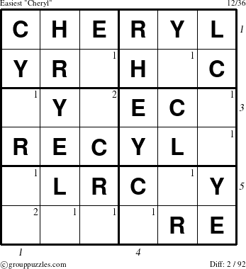 Place each element of the group (C H E R Y L) exactly once in each row, each column, and each 3x2 rectangle.