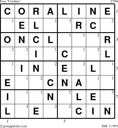 Place each element of the group (C O R A L I N E) exactly once in each row, each column, and each 4x2 rectangle.