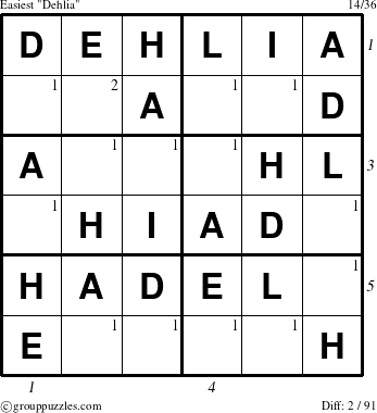 Place each element of the group (D E H L I A) exactly once in each row, each column, and each 3x2 rectangle.