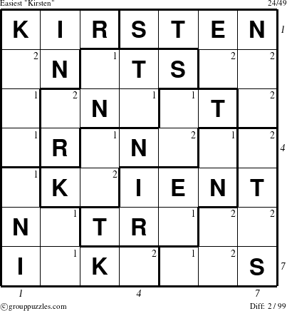 Place each element of the group (K I R S T E N) exactly once in each row, each column, and each septomino.