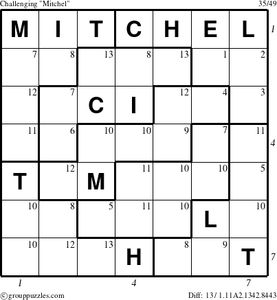 Place each element of the group (M I T C H E L) exactly once in each row, each column, and each septomino.