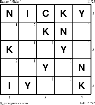 Place each element of the group (N I C K Y) exactly once in each row, each column, and each pentomino.