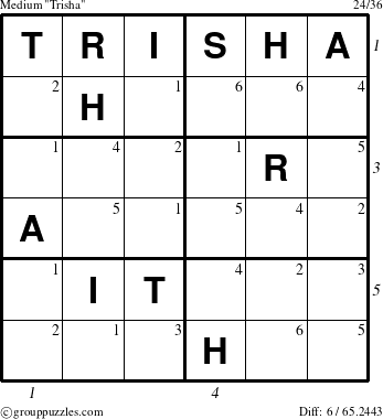 Place each element of the group (T R I S H A) exactly once in each row, each column, and each 3x2 rectangle.