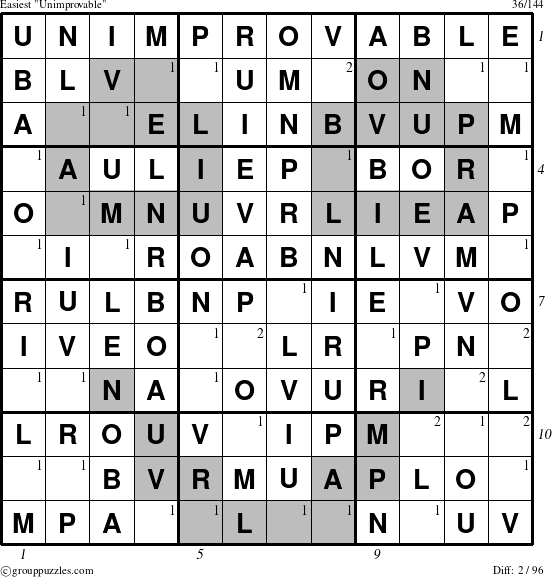 Place each element of the group (U N I M P R O V A B L E) exactly once in each row, each column, each 4x3 rectangle, each eye, and the elements that make up the smile.