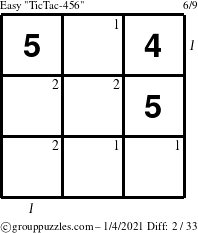 The grouppuzzles.com Easy TicTac-456 puzzle for Monday January 4, 2021, suitable for printing, with all 2 steps marked