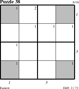 Variations on Junior Sudoku Logic Puzzles (Vol 1)Step-by-Step Instructions for Puzzle 38 (8/16)Diff: 2/71Printable puzzle or puzzle with instructionsThe numbers in the puzzle below refer to the step number at which the value of the location can be deduced. Locations without step numbers contain the initial values found in corresponding puzzle in your edition of the book. | |